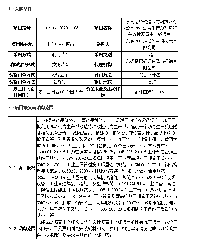 山东高速华瑞道路材料技术有限公司MAC沥青生产线改造特种改性沥青生产线项目谈判采购公告