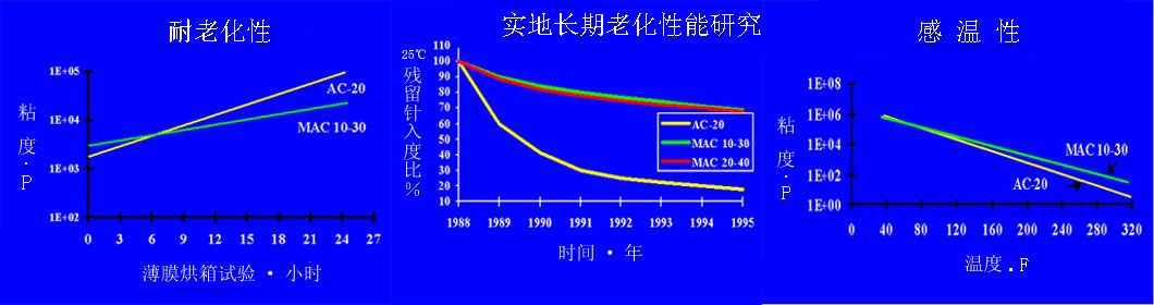 MAC®️改性沥青具有较强的抗老化能力。通过薄膜烘箱加热老化时间与沥青粘度变化的关系曲线可以发现,随着加热时间的增加,MAC®️改性沥青的粘度增长明显低于基质沥青,说明抗老化性能强。通过对实地长期老化性能研究,可以清楚发现,基质沥青在几年的时间内残留针入度比急剧降低,而MAC®️改性沥青的残留针入度比只是随时间缓慢地降低,说明MAC®️改性沥青具有优良的抗长期老化的能力。