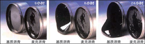 MAC®️改性剂在沥青中通过化学反应生成大量极性物质并产生聚集,形成网状格架结构,使沥青的内聚力大大增强,可生产出高粘度改性沥青。同时由于沥青极性的加强,使沥青与集料表面的粘附性增强。基于上述两种原因,沥青与集料胶结体系的胶结强度也随之大大提高。MAC®️改性沥青呈凝胶状,这种凝胶结构使沥青不会轻易移动,且其品质稳定,不会产生离析。室温下,基质沥青或其他改性沥青随时间流逝而流动,而MAC®️改性沥青不随时间而流动。